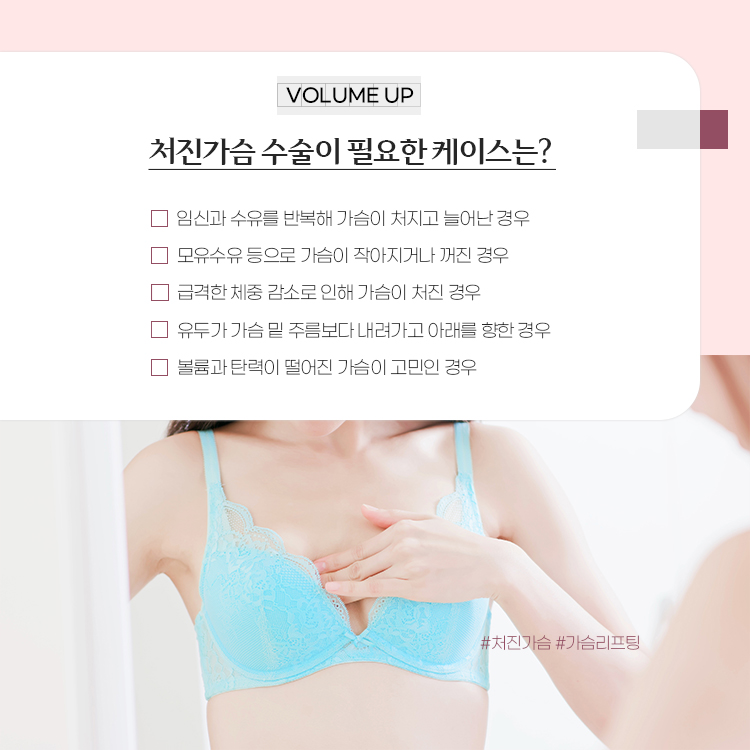 출산·수유·체중 변화·노화로 인해 가슴은 볼륨이 줄고 아래로 처지게 됩니다.