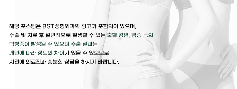 비에스티에서는 전체 박리를 통해 처진 피부는 확실하게 제거하고 벌어진 복직근을 모아주면서 특수한 봉합법을 사용해 흉터가 기다란 일자 선으로만 남으며 팬티 라인 안으로 감춰져 평소에는 눈에 띄지 않아 여성분들의 경우 수술 후 크롭티를 입는 것도 문제 없습니다.