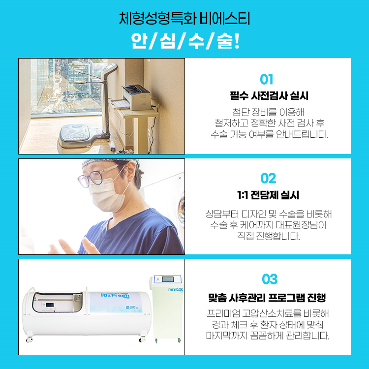 고압산소치료의 경우 고가의 장비이기 때문에 병원 내에 구비하고 있는 곳이 많지 않은데요. 피부를 회복시키는데 탁월한 효과가 있기 때문에 피부를 절개하는 체형 거상수술을 생각중이시라면 이런 사후관리 프로그램이 어떻게 진행되고 있는지 꼭 확인해보시기 바랍니다.