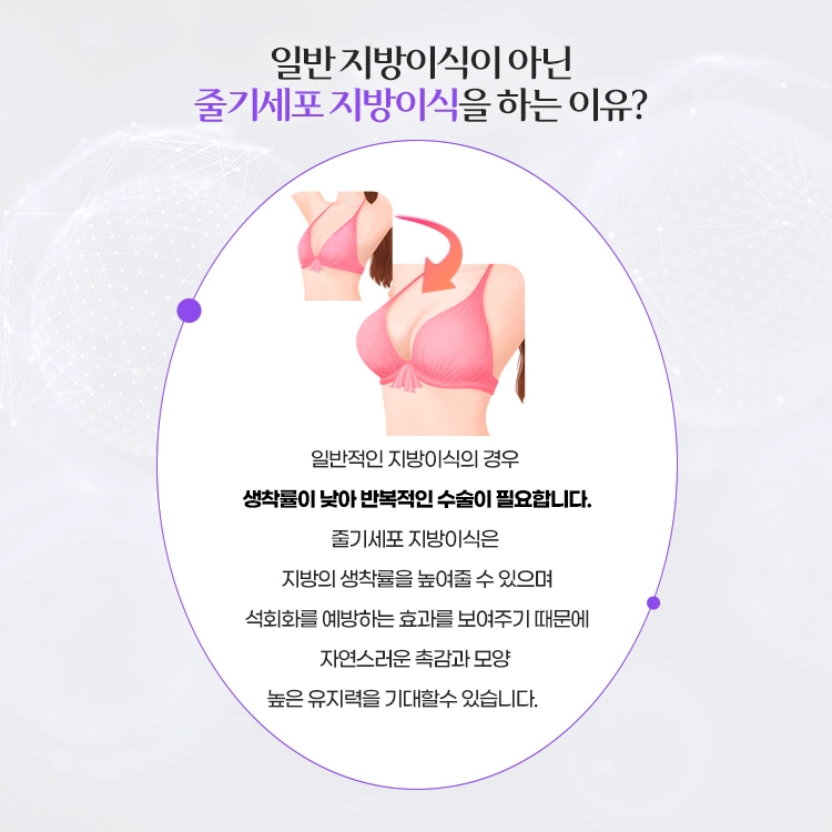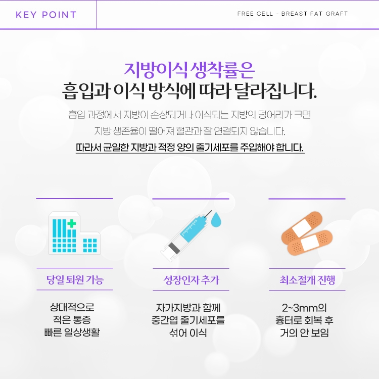 일반 지방이식으로는 충분한 결과를 얻기 힘들다고 판단이 될 때에는 그냥 순수지방만 이식하기 보다는 줄기세포와 같은 성장인자를 추가해서 수술을 하는 것이 더 도움이 됩니다.