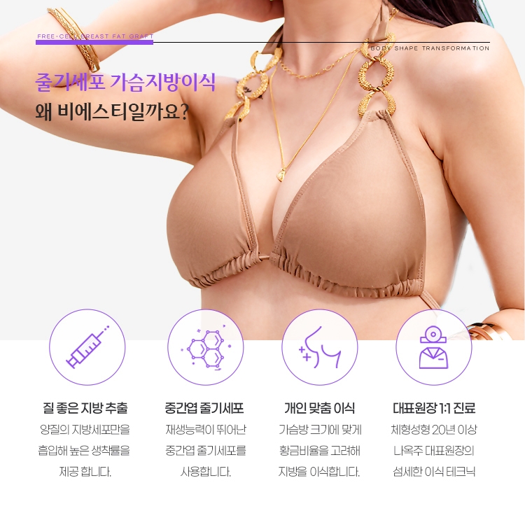 마른체형을 갖고 있는 여성들은 특히나 가슴 볼륨에 대한 아쉬움이 큰데요. 그전에는 가슴을 키우기 위한 수술적인 방법은 보형물을 넣는 방법이 유일했지만 지금은 볼륨 개선을 위한 해결책으로 가슴지방이식이 주목을 받고 있습니다.