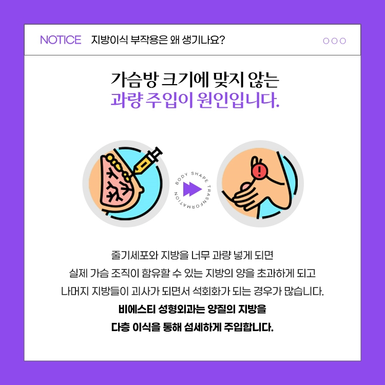과거에는 지방을 많이 넣을수록 더 잘 살아남을 수 있다고 생각했지만 오히려 과하게 주입된 지방은 생착되지 못하고 석회화 등의 부작용 확률이 높아지는 것으로 나타났습니다. 그래서 최근에는 가슴지방이식을 원하는 환자의 가슴방 크기에 맞춰 적정 용량을 주입하고 또 유선을 제외한 가슴 전체에 고르게 이식해야 생착률을 높일 수가 있습니다.