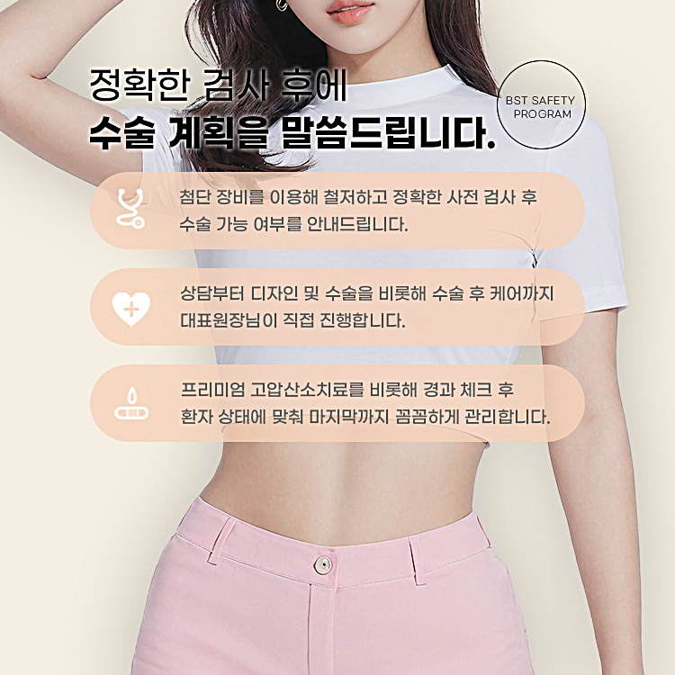 복부거상술에 궁금한 점이 있다면 체형성형중점진료 BST성형외과에 물어보세요. 복부 뿐만 아니라 가슴, 엉덩이, 팔, 허벅지 등 다양한 신체 부위의 거상술을 진행하고 있는 곳입니다.