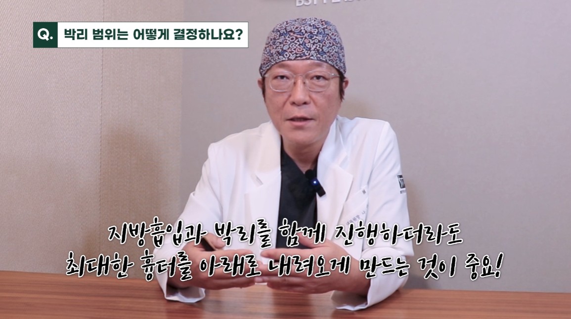피부 탄력과 가동화 범위가 충분해야 흉터를 낮추고 라인을 매끄럽게 만들 수 있습니다. 필요 시 박리 범위를 확대하거나 지방흡입을 추가해야 합니다.