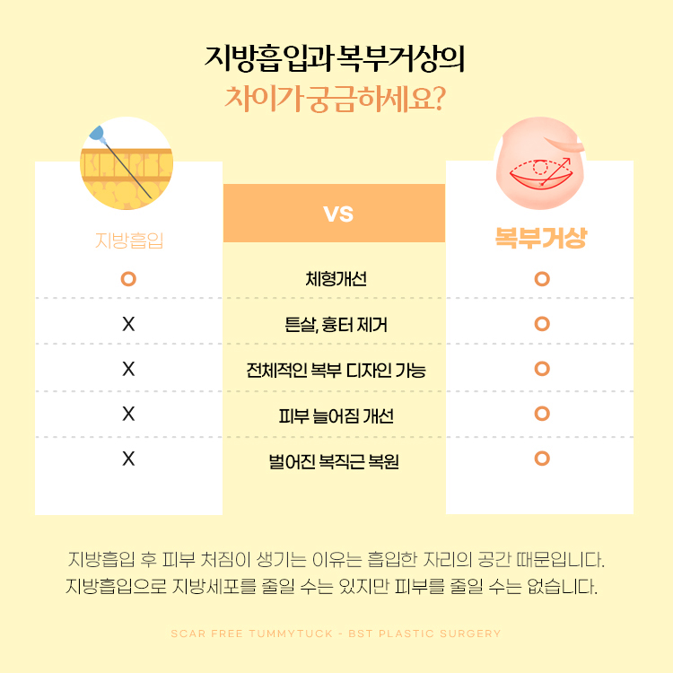 지방흡입으로도 개선하기 힘든 배도 있다는 거 알고 계시죠? 지방흡입은 피부와 근육층 사이에 있는 피하지방을 빼내서 부피를 줄이기 때문에 군살이 있는 몸의 라인 교정을 하는데는 효과적이