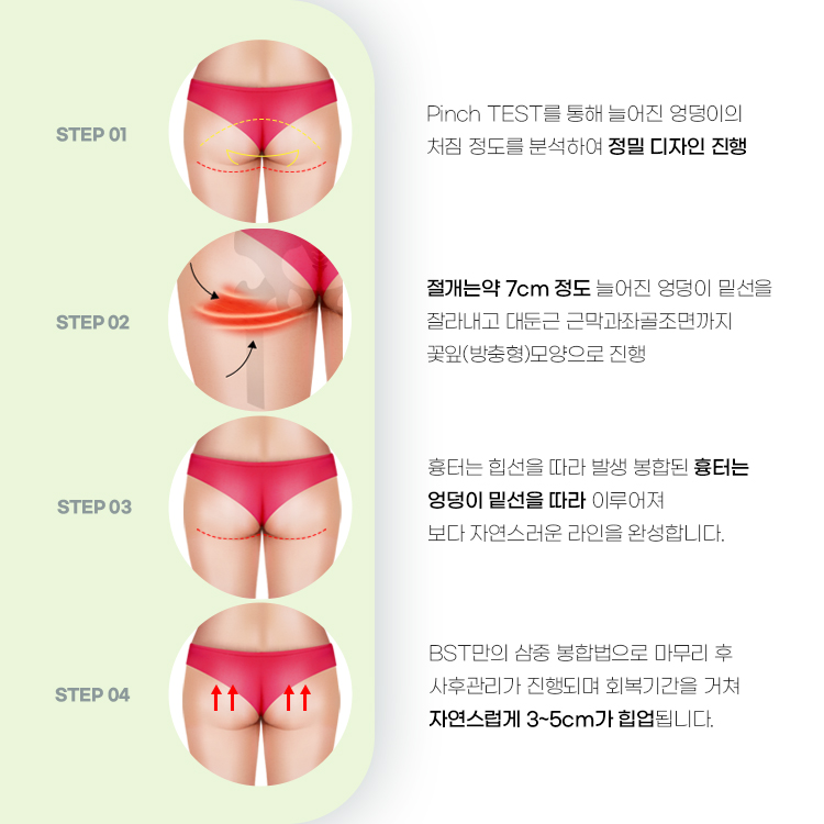그래서 어느정도 흉터가 남을 수밖에는 없지만 기존의 엉덩이 밑선 자리에 흉터가 위치하기 때문에 크게 눈에 띄지 않고 시간이 지나면서 색소가 빠지게 되면 흰색 선으로만 남아 흉터에 대한 부담을 더 줄일 수 있습니다.