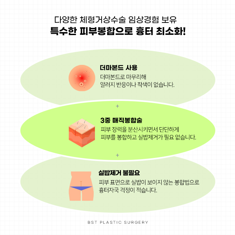 BST성형외과에서는 피부 장력을 분산시키는 특수 봉합법인 3중 매직봉합술을 통해 실밥제거가 필요없는 봉합방식을 사용하고 있습니다. 봉제인형처럼 흉터가 크게 남지 않고 가늘고 얇은 선으로만 남게 됩니다. 또한, 상처 회복을 돕는 프리미엄 사후관리인 고압산소치료를 비롯해 고주파, 재생레이저, 수술 부위 뭉침을 풀어주는 에스테틱 관리도 진행하고 있습니다.