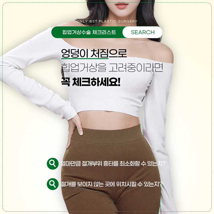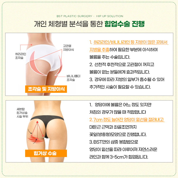 그래서 힙거상수술을 통해서 개선을 하는 것이 가장 효과적이라고 할 수 있습니다. BST성형외과 나옥주 대표원장님은 체형성형 20년 경력 이상으로 사전검사를 통해 환자의 힙 고민점에 따라 진단 후 수술 계획을 잡습니다. 엉덩이 살빼기가 고민이라면 지금 현재 내 엉덩이의 상태를 체크하고 적합한 방법을 찾아야 부작용도 줄이고 만족도를 높일 수가 있습니다.