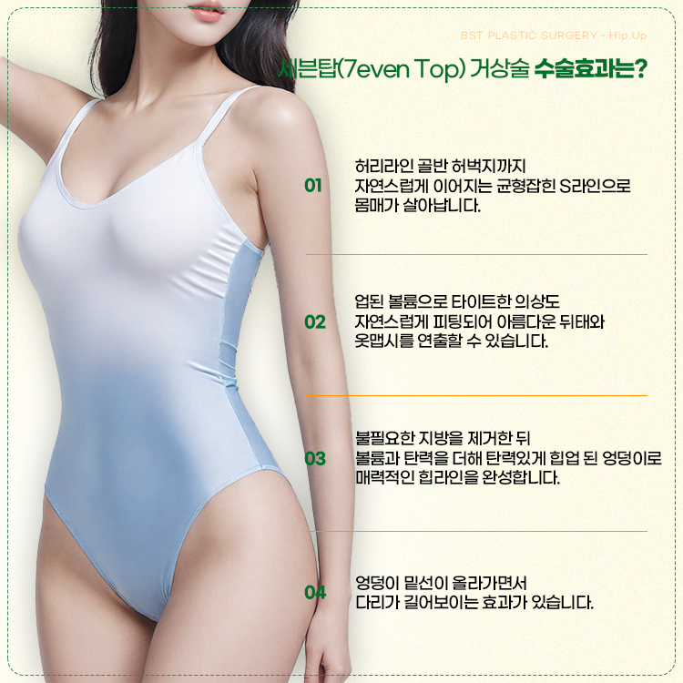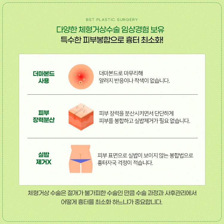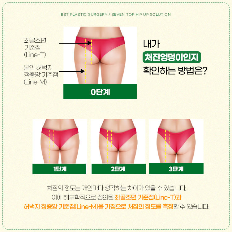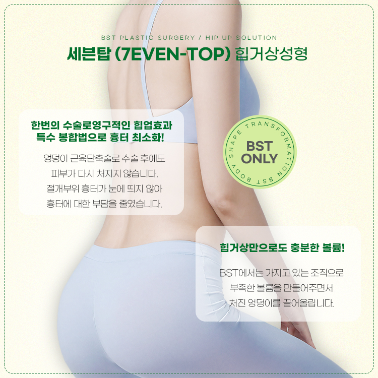 체형중점진료 BST성형외과에서는 엉덩이 밑선 절개를 통해 처진 피부와 근육은 끌어올리면서 흉터는 엉덩이 아래로 위치시키기 때문에 눈에 덜 띄고 시간이 지나면서 얇은 선으로만 남게 됩니다.