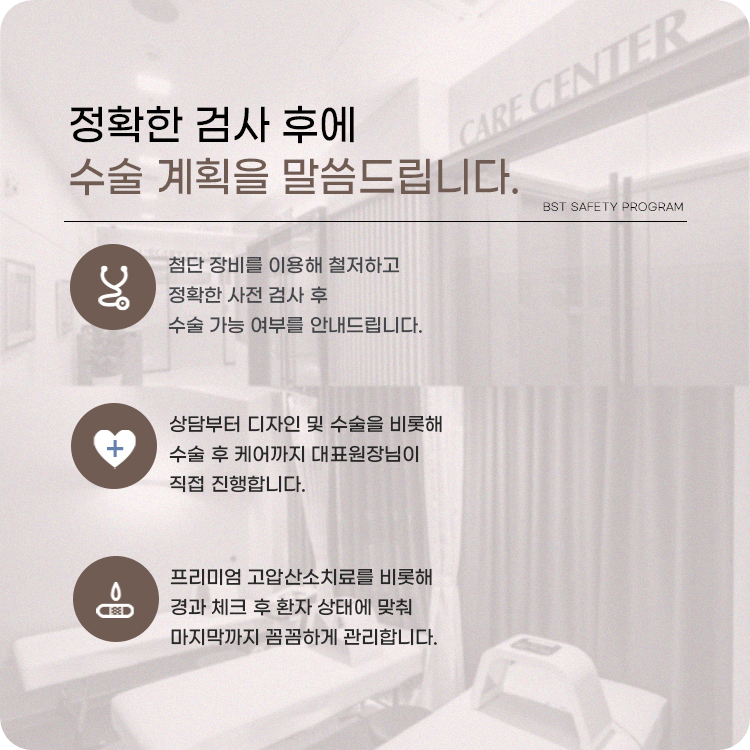체형중점진료 BST성형외과에서는 피부가 줄어드는 양을 늘리면서 피부가 밑에 있는 근육에서 많이 떠 있지 않게 유착을 시키는 방법을 사용해 지방흡입 부작용을 예방합니다. 단순하게 지방흡입만 했을 때보다 훨씬 피부 양이 많이 줄어들면서 울퉁불퉁해지거나 주름이 지는 부작용 없이 피부가 잘 달라붙게 됩니다.