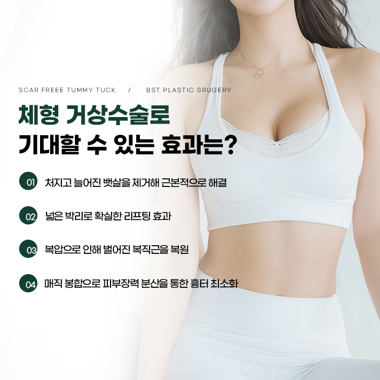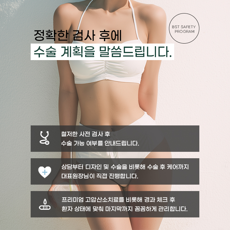 "단순한 변화가 아닌, 본연의 회복을 돕는 진짜 성형을 합니다." BST 성형외과는 체형성형에 집중하는 병원입니다. 수많은 케이스를 바탕으로 복부거상, 가슴거상, 힙거상, 팔거상, 허벅지거상 등