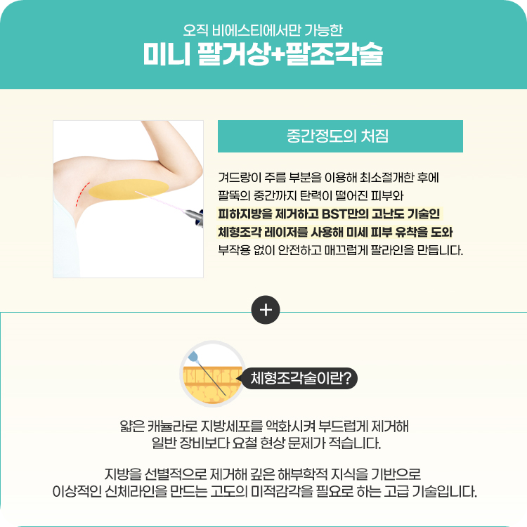 최소 절개를 최대 효과를 볼 수 있다면 정말 좋겠지만 모든 거상수술은 충분한 효과를 느끼기 위해서는 피부 늘어짐이 심할 수록 절개 길이가 확보가 되어야 합니다. BST성형외과에서는 전체 팔뚝 거상을 하더라도 총 절개 길이가 팔꿈치까지가 아닌 팔꿈치 전에 위치하고 있어 다른 곳과 비교했을 때 상대적으로 짧은 편에 속합니다.