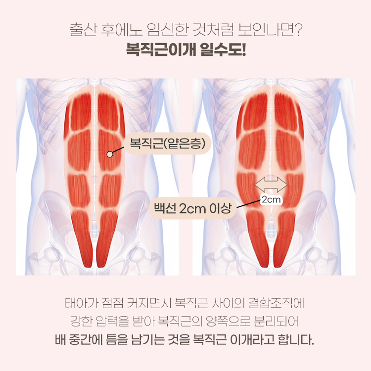 가장 대표적인 이유는 바로 복근이 분리되는 현상인 복직근이개라고 할 수 있는데요. 임신 중에 아기가 복부 앞쪽에 있는 두개의 큰 근육인 복직근을 밀어내면서 복직근이개가 생기게 됩니다. 한번 벌어진 근육은 출산 후에도 완전히 돌아오지 않고 분리된 상태로 남는 경우가 많은데요. 이로 인해서 배가 돌출되어 보이거나 배크기가 줄어들지 않아 자연스럽게 배를 평평하게 만드는 것이 어렵게 됩니다.