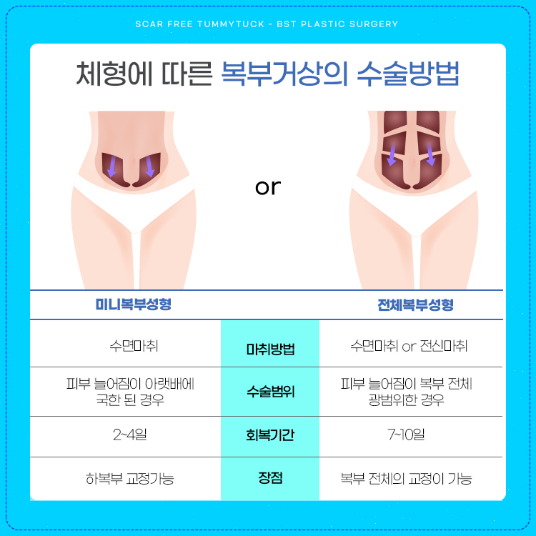 전체 복부 성형술은 복부 전체를 다루며, 미니 복부 성형술은 배꼽 아래의 하복부에 집중합니다. 흉터는 보통 비키니 라인에 숨겨지며, 회복 기간은 개인에 따라 차이가 있을 수 있지만 일주일이면 일상생활을 하는데 크게 무리 없습니다. 단 3개월까지는 환자는 충분한 회복을 위해서 격렬한 활동을 피해야 합니다.