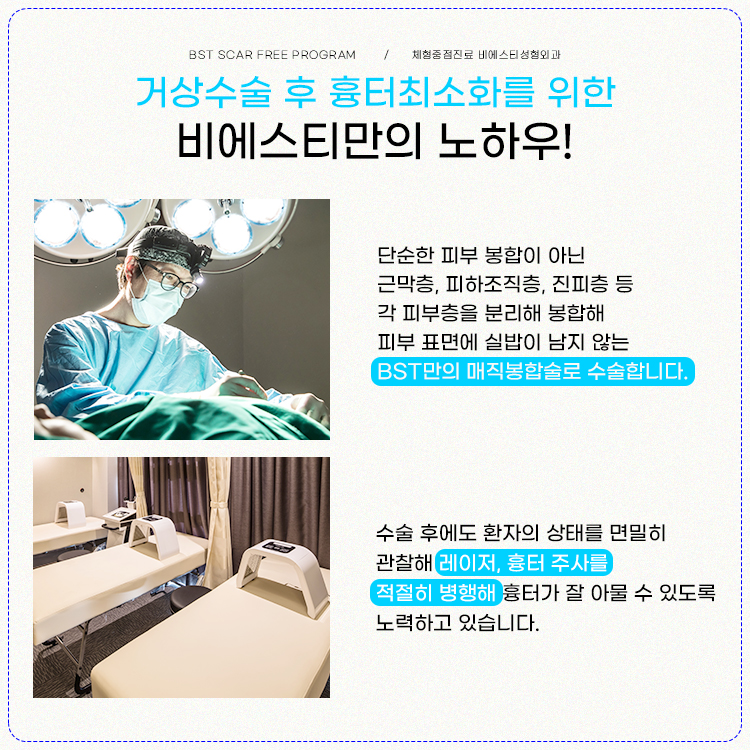 비에스티성형외과를 기준으로 설명드리자면, 전체적으로 절개와 박리를 하면서 충분히 수술 효과를 볼 수 있도록 하고 흉터의 모양도 U자나 V자 모양이 아닌 일자에 가까운 완만한 형태로 속옷 아래로 감춰질 수 있도록 합니다.