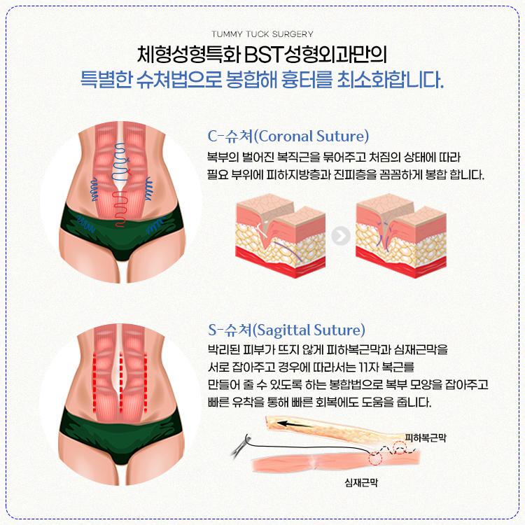 출산으로 인해 늘어진 뱃가죽을 제거하기 위해서는 절개를 한 후에 늘어난 만큼 잘라내고 봉합해주는 과정이 필요합니다. 지방흡입과의 가장 큰 차이점일도 이 절개가 들어간다는 점이겠죠. 그래서 복부에 가로로 긴 흉터 자국이 생길 수밖에 없는데요.