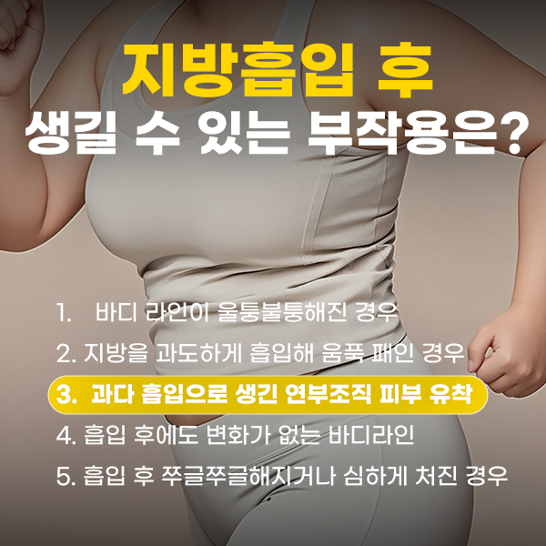 부적절한 사후 관리: 압박복 착용을 소홀히 하거나, 흡입 후 회복 과정을 충분히 관리하지 못한 경우.