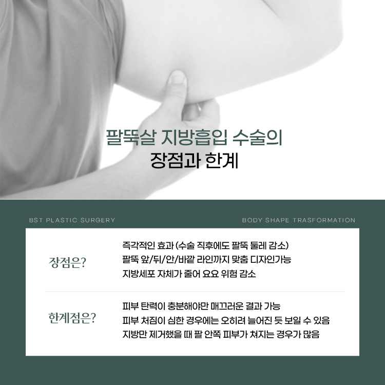 - 지방만 제거했을 때 팔 안쪽 피부가 쳐지는 경우가 많음