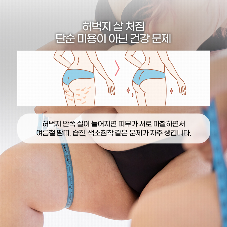 허벅지 안쪽 살이 늘어지면 피부가 서로 마찰하면서 여름철 땀띠, 습진, 색소침착 같은 문제가 자주 생깁니다.